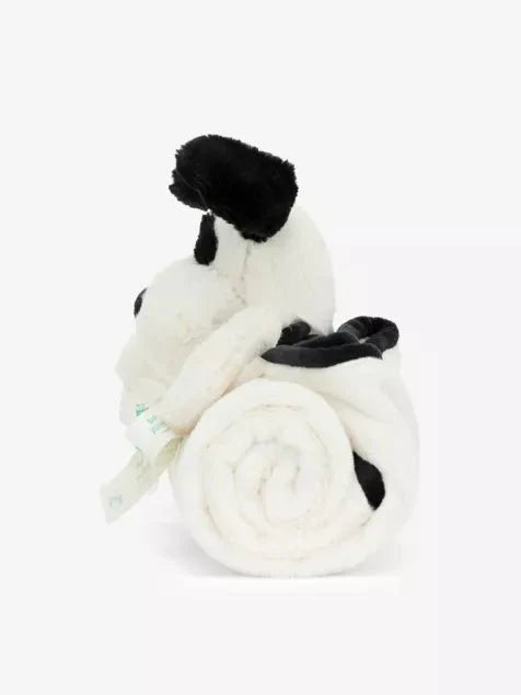 Introducing the delightfully soft and snuggly Bashful Black & Cream Puppy Blankie. Combining our most loved Bashful Puppy’s adorably perky black ears, cream squashy paws and oval squishy nose with a blankie made from the same irresistibly soft fur made of recycled fibres. Neatly rolled and tied with a Baby Jellycat grosgrain ribbon, this is an endearing gift full of comfort and companionship.